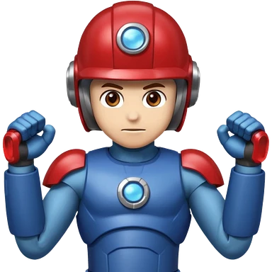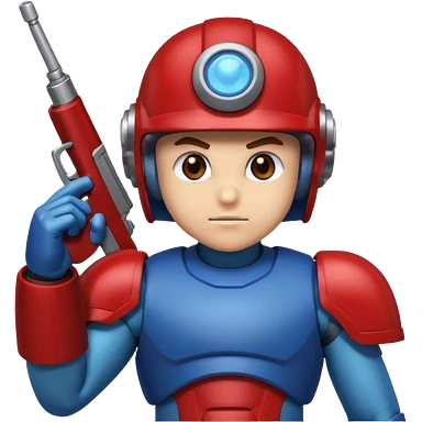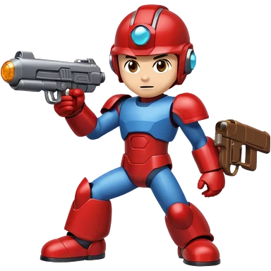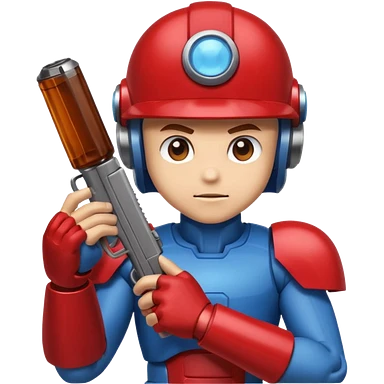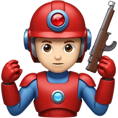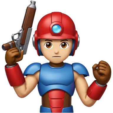 mega man but with the color rootbeer brown shiny like metal with arms for guns and a dark shiney red healmet emoji | AI Emoji Generator
