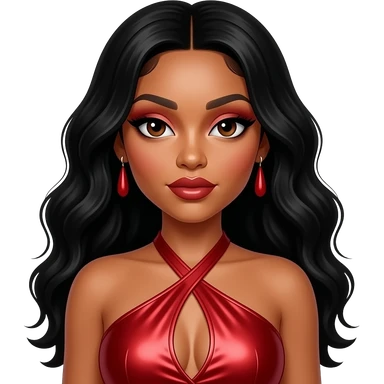 Megan thee Stallion with dark brown eyes, long black hair, red eyeshadow and lipstick, red metallic halter dress, red earrings emoji