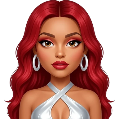 Megan thee Stallion with dark brown eyes, long bright red hair, red eyeshadow and lipstick, white metallic halter dress, white earrings emoji