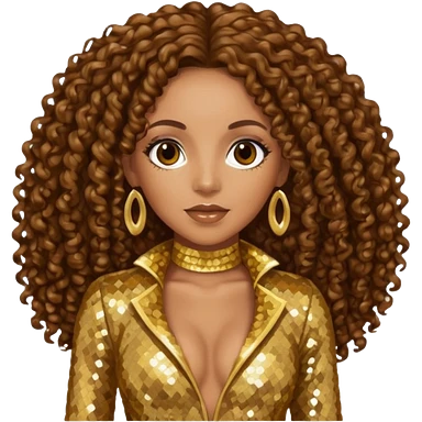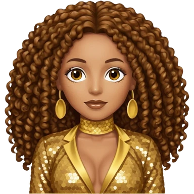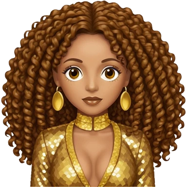 Melanie Brown with brown long curly hair, gold outfit emoji