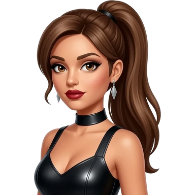 Melody Thornton from The Pussycat Dolls with light brown skin, dark brown eyes, long brown high ponytail hair, black eyeshadow, dark red lipstick, black metallic halter dress, silver earrings emoji