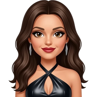 Melody Thornton from The Pussycat Dolls with light brown skin, dark brown eyes, long dark brown hair, black eyeshadow, dark red lipstick, black metallic halter dress, silver earrings emoji