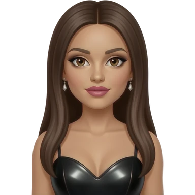 Melody Thornton from The Pussycat Dolls with dark brown eyes, long brown straight hair, black eyeshadow, pink lipstick, black metallic sweetheart dress, earrings emoji
