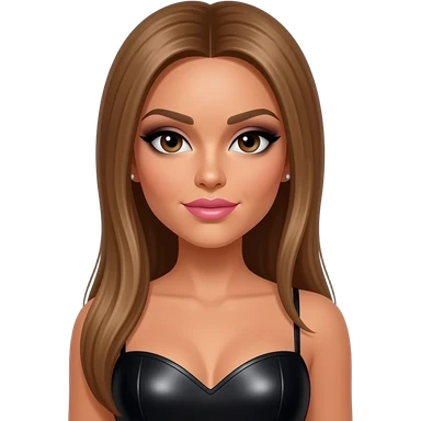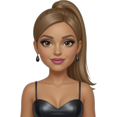 Melody Thornton from The Pussycat Dolls with tan skin, dark brown eyes, long light brown straight high ponytail hair, black eyeshadow, pink lipstick, black metallic sweetheart dress, earrings emoji