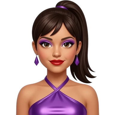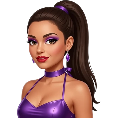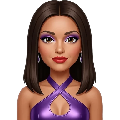 Melody Thornton from The Pussycat Dolls with medium dark skin, dark brown eyes, long light brown 2000s hair, purple eyeshadow, red lipstick, purple metallic halter dress, earrings emoji | AI Emoji Generator