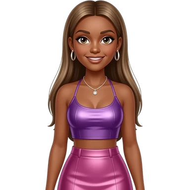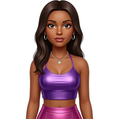 Melody Thornton with dark skin, dark brown eyes, long brown straight hair, purple metallic halter crop top, pink metallic long skirt, necklace and earrings emoji