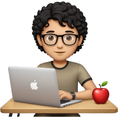 memoji of a man with a laptop in front, apple-style, modern, dark add a curly hair and glasses emoji