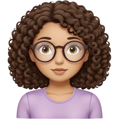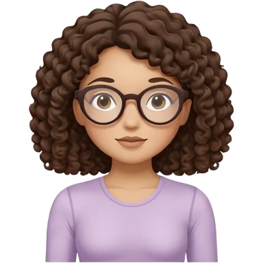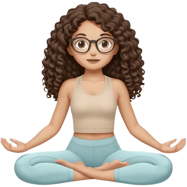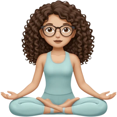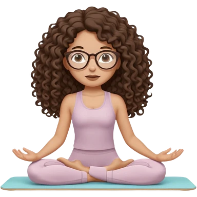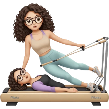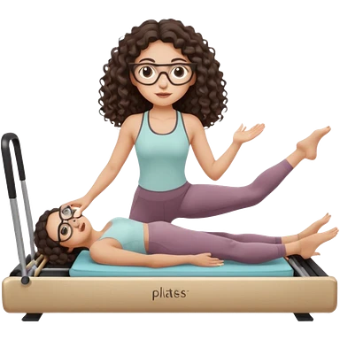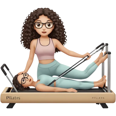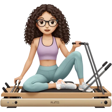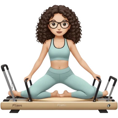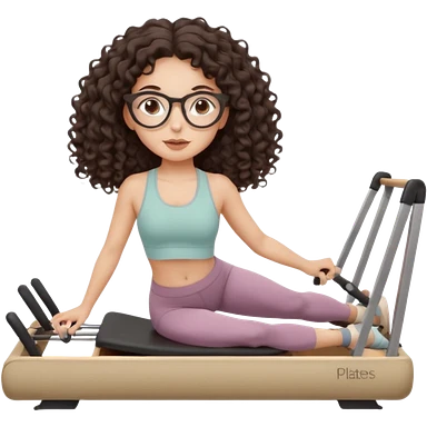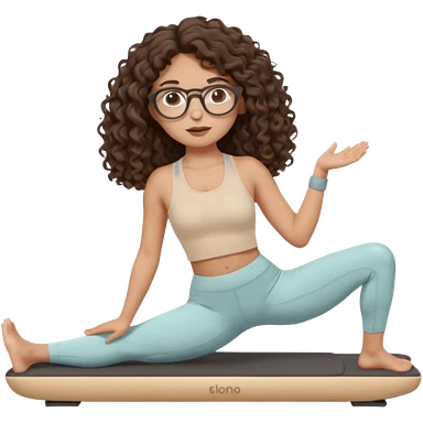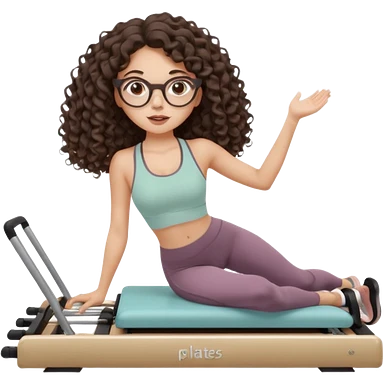 Memoji-stylegirl with long dark brown curly hair, round glasses, large brown eyes, soft rounded face, warm beige skin tone, wearing neutral Pilates activewear, calm wellness aesthetic, pastel colors, sticker-style digital illustration, smooth shading, white outline,reformer pilates doing. emoji
