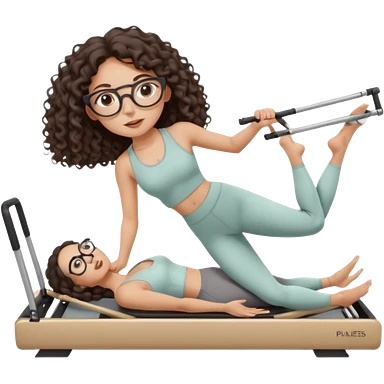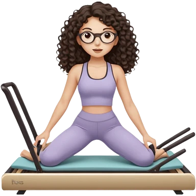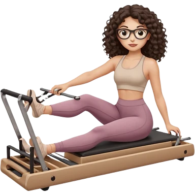 Memoji-style girl with long dark brown curly hair, round glasses, large brown eyes, soft rounded face,makeup, warm beige skin tone, wearing Pilates activewear performing Pilates and reformer Pilates exercises on a reformer machine, pastel color palette, smooth soft shading emoji