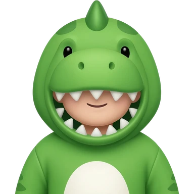 🦖 Costume Le costume est vert vif avec un ventre blanc au centre. Sur la tête, il a une capuche en forme de tête de dinosaure, avec de petites dents triangulaires autour du visage. On voit aussi une petite crête ou pointe sur le dessus de la tête, pyjama 😀 Visage Le visage est très cartoon emoji