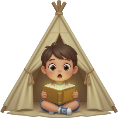 KID AMAZED EXPERSSION WHILE LOOKING AT A GLOWING BOOK inside a "child's drawing" tent shape. emoji