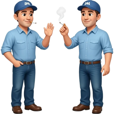 Two different blue collar men waving to each other smoking cigarettes emoji