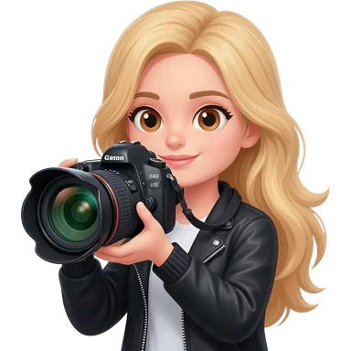 menina loira pele clara olhos castanhos claros com uma camera fotografia e uma ente grade na mão ela é fotogrsfae video maker emoji