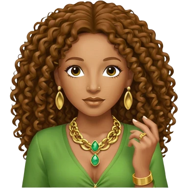 Mulher de pele branca, olhos cor de mel e cabelos cacheados de cor castanho claro, usando óculos dourado emoji