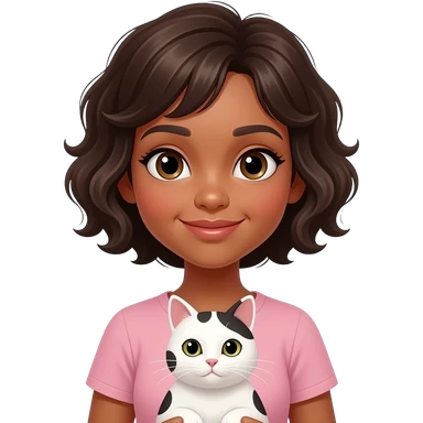 Menina parda cabelo curto ondulado segurando seu gato branco com pintinhas pretas emoji