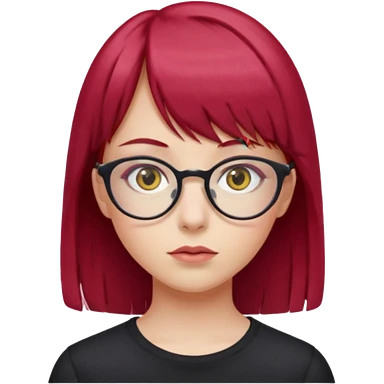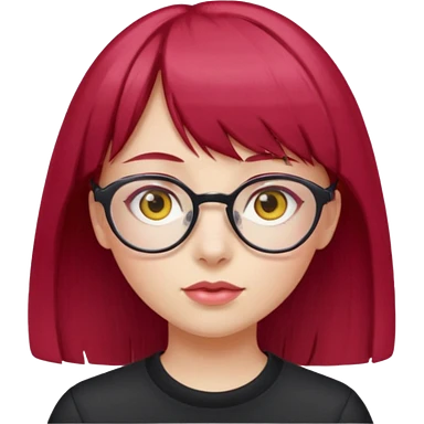 Menina com cabelos vermelho Cherry, liso com franja,olho direito rosa e olho esquerdo amarelo,pele clara e com oculos emoji
