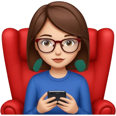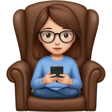 Menina de cabelos castanhos e óculos sentada numa poltrona olhando o smartphone emoji
