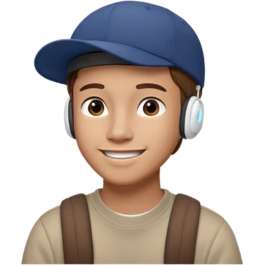 Only the head of a young guy with brown hair smiling with airpods in his ears and a cap on his head turned back. emoji