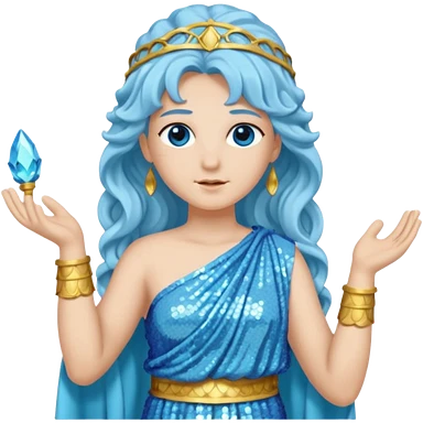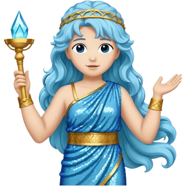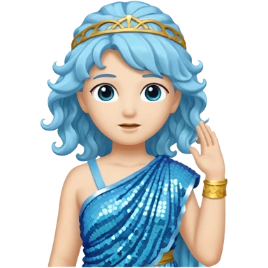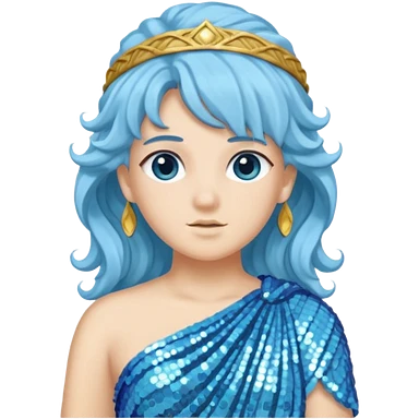 Athena from Roman Deities with long light blue wavy hair, light blue sequin toga emoji