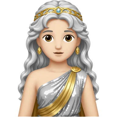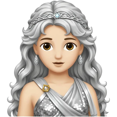 Diana from Roman Deities with long silver wavy hair, silver sequin toga emoji