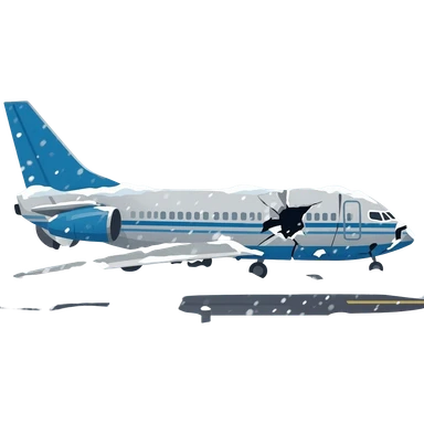 Yoğun kar fırtınası sırasında piste çarpmış, hasar görmüş bir kargo uçağı. 🌨️✈️❄️ emoji