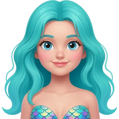 portrait of a mermaid with long flowing sea-green hair, shimmering blue-scaled tail, shell bra, holding a pearl in one hand, smiling softly, front-facing, surrounded by glowing sea particles, fantasy style emoji