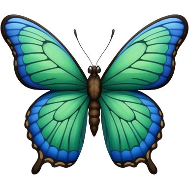 A butterfly with blue edges, green wings, and a black body, Between the wings brown emoji
