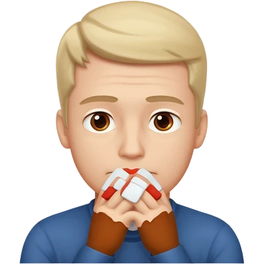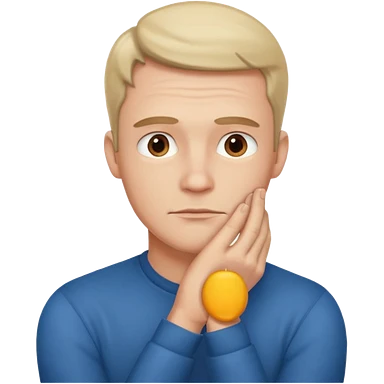 caramel skin color. Teen age. Short buzz, messy blonde hair, dark brown bushy eyebrows large expressive golden-brown eyes, brown skin color, scar over nose, wearing a plain white t-shirt. Disappointed thinking facial expression. caramel skin color. 20 year old male. emoji
