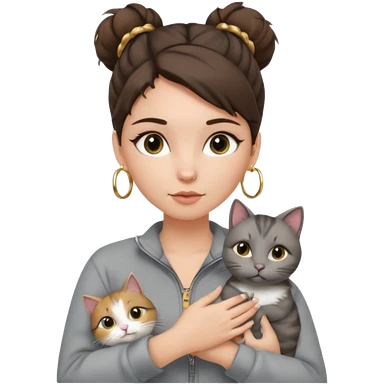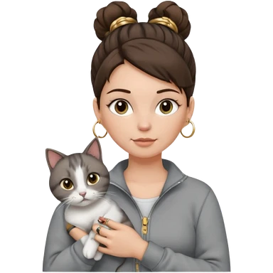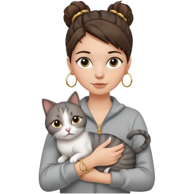 a white girl with brunette hair in a messy bun holding a grey cat. the girl has long lashes and has on a grey zip up that is half way zipped and under a white shirt and gold jewelry that is hoop earrings and gold bracelets. emoji