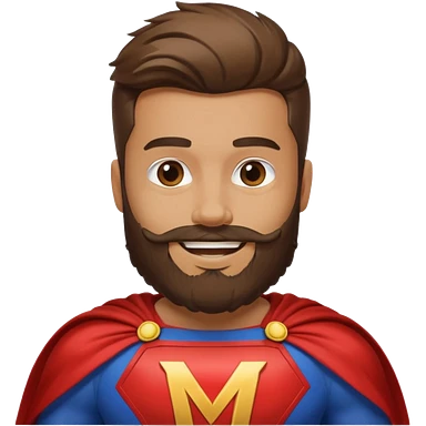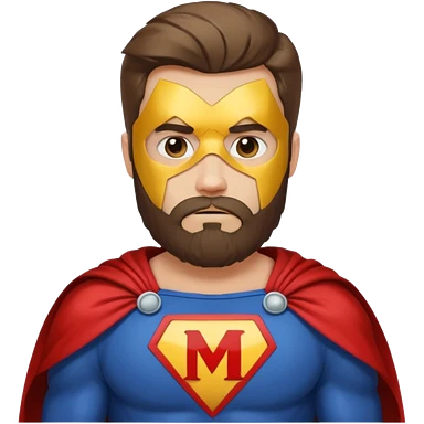 бородатый мужчина в костюме супер героя с буквой М на груди веселится emoji