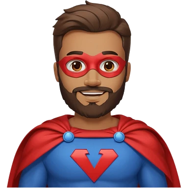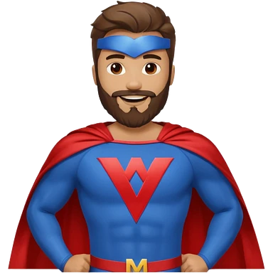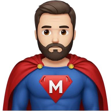 бородатый мужчина в костюме супер героя с буквой М на груди emoji
