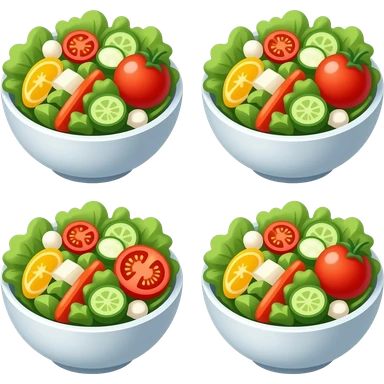 Create a "Find the Odd One Out" puzzle with 4 salad emojis. All salads should look almost identical, colorful, and cartoon-style. 3 are exactly the same, and 1 has a small difference (one missing tomato slice). Keep the background clean and minimal. Arrange them in a grid. emoji