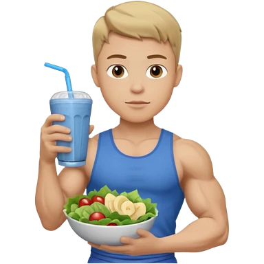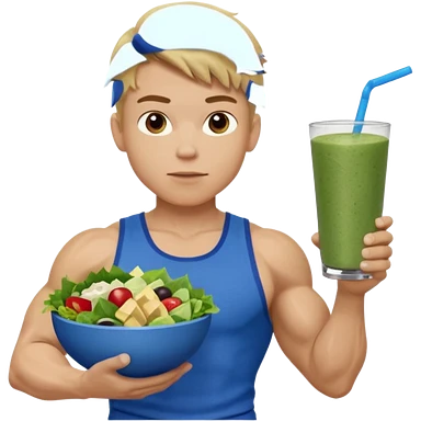 A young male person with a muscular, well-defined build. He has short blonde hair, a light skin tone, and a neutral facial expression. He wears blue cloth. He is holding a salad in one hand and a protein shake in the other. emoji