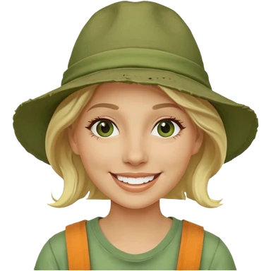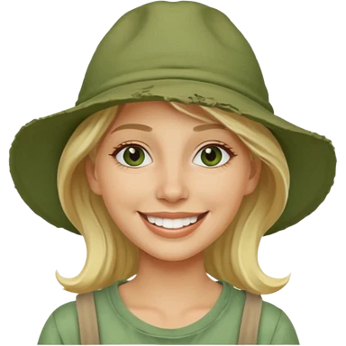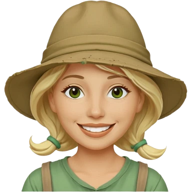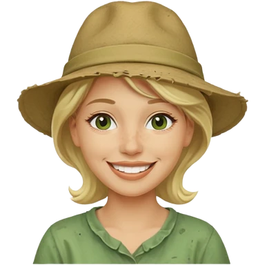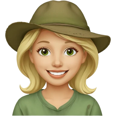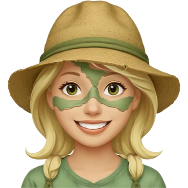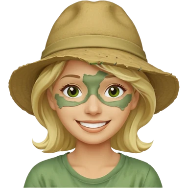 messy green clay mask and tourist hat blond woman smiling and clay mask on face emoji
