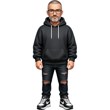 full-length photo of extreme streetwear clean-shaven face cool boy metal-framed glasses ery entellectual man, 65 years old, street wear stubble, shaved short with clippers emoji