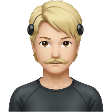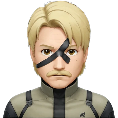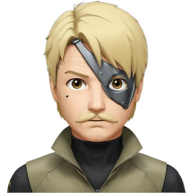 Style : Manga détaillé façon Metal Gear Solid — lignes nettes, ombres douces, couleurs vives. Personnage : cache-œil noir à gauche, cheveux blonds mi-courts avec côtés foncés, yeux marron, moustache fine, sweat clair. emoji