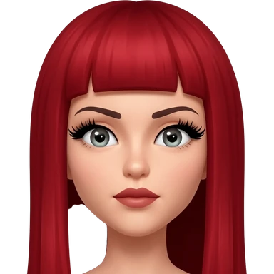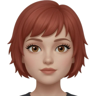 Red cherry short hair, two slits on left eyebrow, 1 slit on right eyebrow, fake long lashes, makeup, Brown eyes emoji