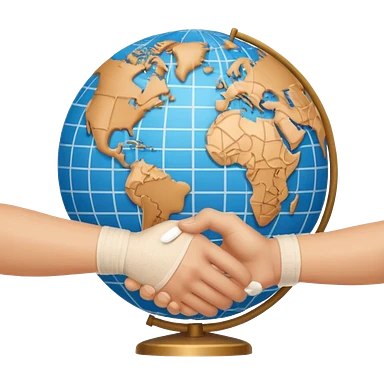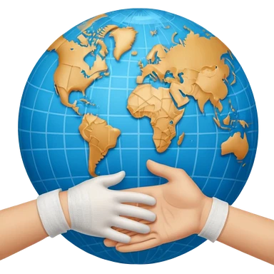 instead of two hands holding a globe, we have two hands handshaking in front of a globe. And in the background, we can see that the globe has a bandage or something. THE GLOBE HAS THE BANDAGE NOT THE HANDS emoji