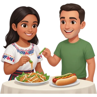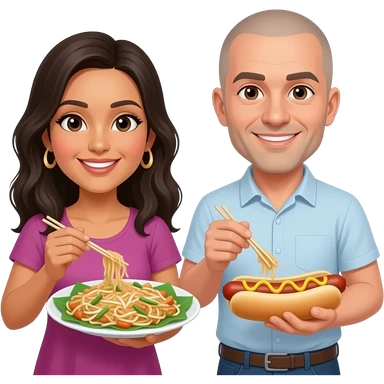 Mexican woman and white man with shaved head sharing pad thai and hot dogs emoji