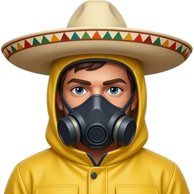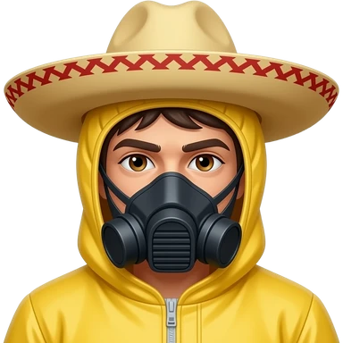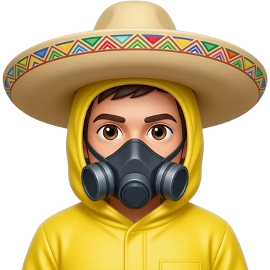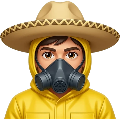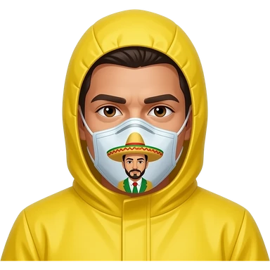 mexican man dark brown hair yellow hazmat suit with hood on and mask with sombrero emoji