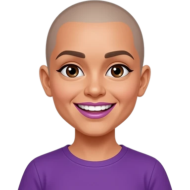 Mexican girl brown eyes whos bald snd and had a wide smile showing both sides of her teeth every single tooth purple shirt push her hairline back give her purple lip gloss emoji