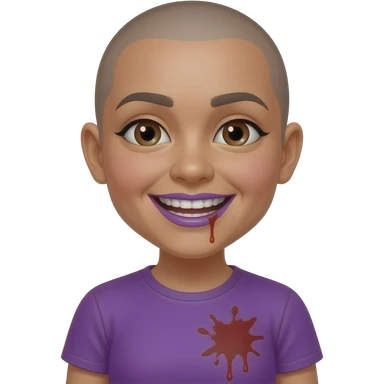 Mexican girl brown eyes whos bald snd and had a wide smile showing both sides of her teeth every single tooth purple shirt push her hairline back give her purple lip gloss put blood stainds in her shirt emoji
