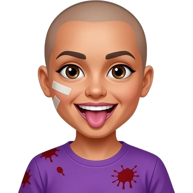Mexican girl brown eyes whos bald snd and had a wide smile showing both sides of her teeth every single tooth purple shirt push her hairline back give her purple lip gloss put blood stainds in her shirt put a bandage oh her cheeck stick her tounge out emoji