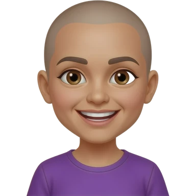 Mexican girl brown eyes whos bald snd and had a wide smile showing both sides of her teeth every single tooth purple shirt push her hairline back emoji