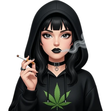 Dark haired gothic woman smoking a weed cigarette, wearing black hoodiess with a Marijuana leaf on each hoodie. Smoke coming from the cigarettes around her in the air. emoji