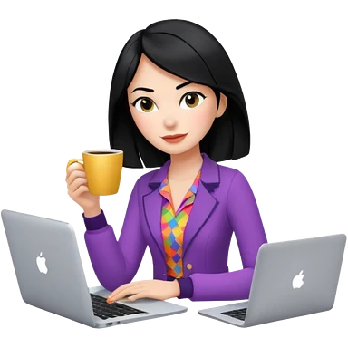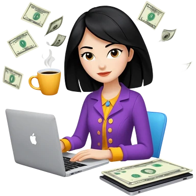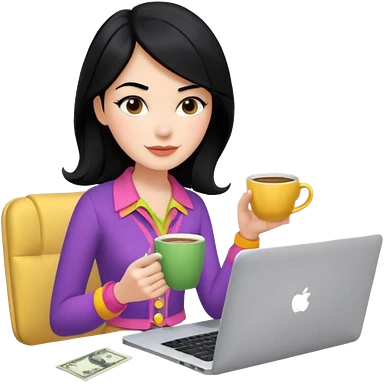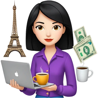 woman character with laptop and coffee in Paris, dollars coming out from the screen floating, colorful chic outfit, white laptop, Pixar style, black hair, fair skin, emoji