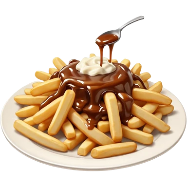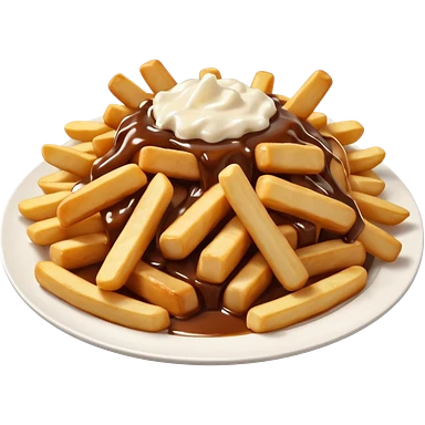 poutine, québec, white cheese curds with gravy on fries in a white plate emoji