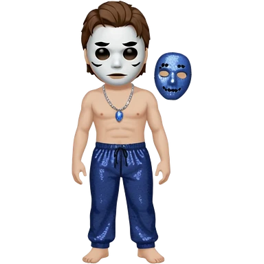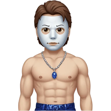Michael Myers with white mask with brown hair, indigo sequin baggy pants, shirtless with necklace emoji