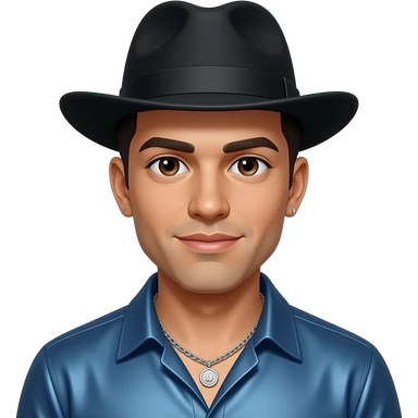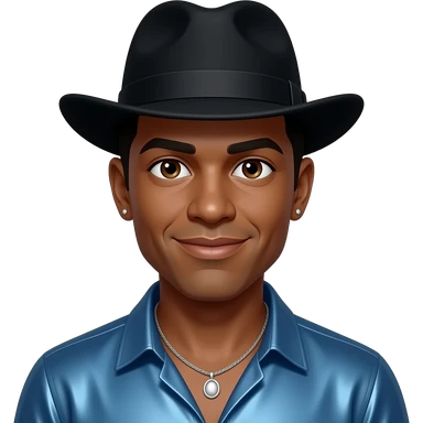 Michael Colyar with dark brown eyes, black hair, black hat, blue metallic shirt, silver necklace and short earrings emoji