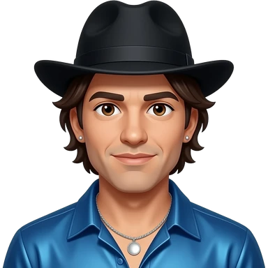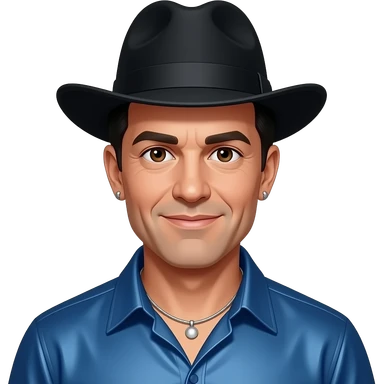 Michael Colyar with dark brown eyes, dark brown hair, black hat, blue metallic shirt, silver necklace and short earrings emoji